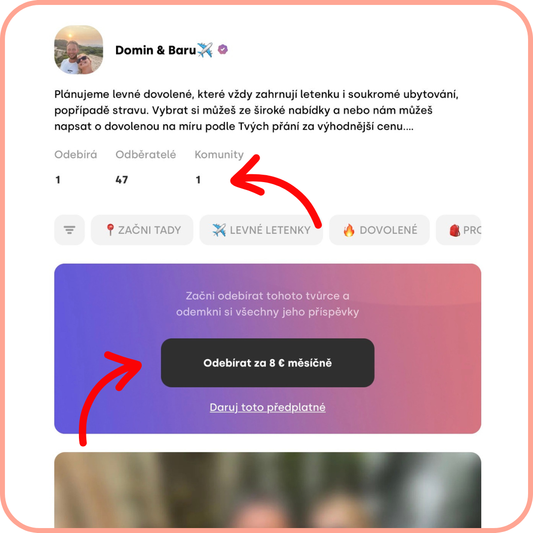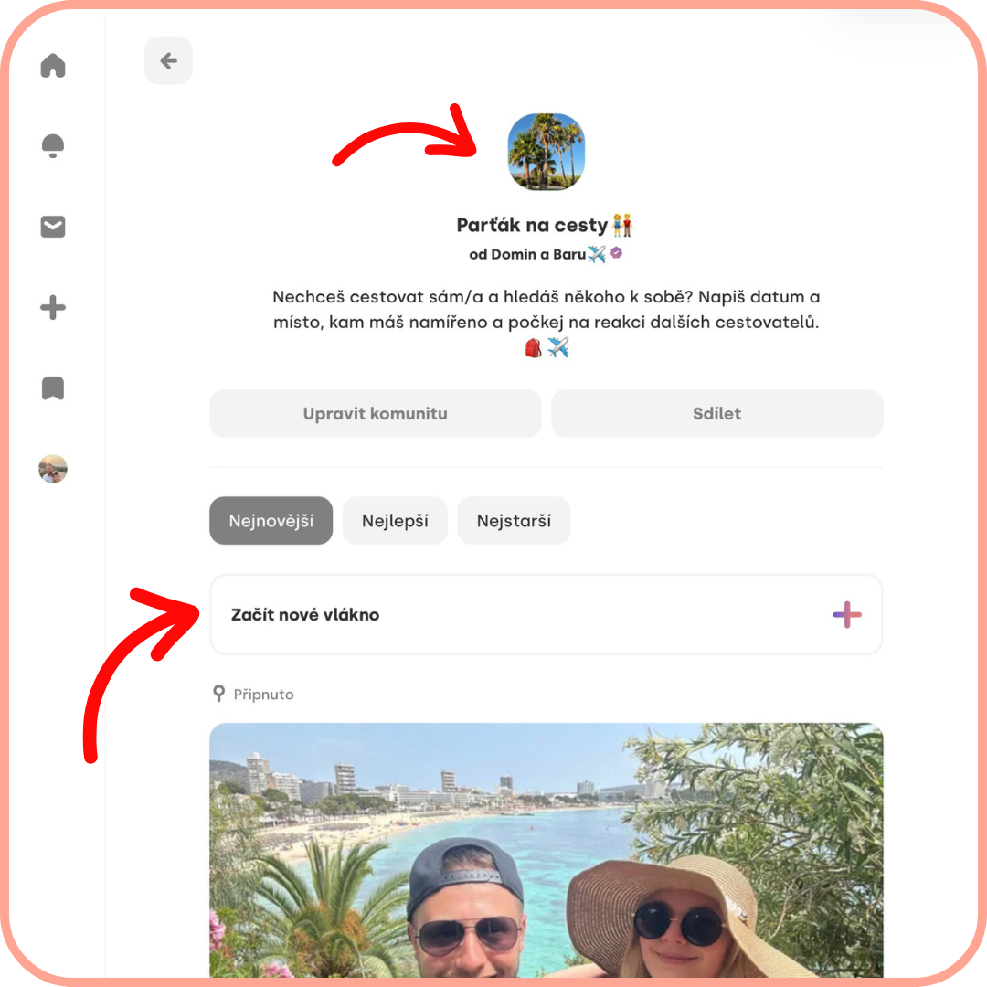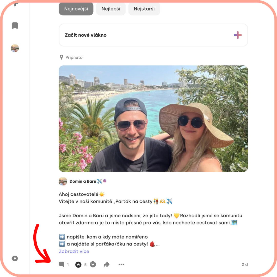 Hned po připojení uvidíte náš úvodní příspěvek ➡️ tam je vysvětlené, k čemu komunita slouží a jaké jsou její pravidla a už pod ním v komentářích někdo píše, že hledá parťáka na cesty. ✈️🫶